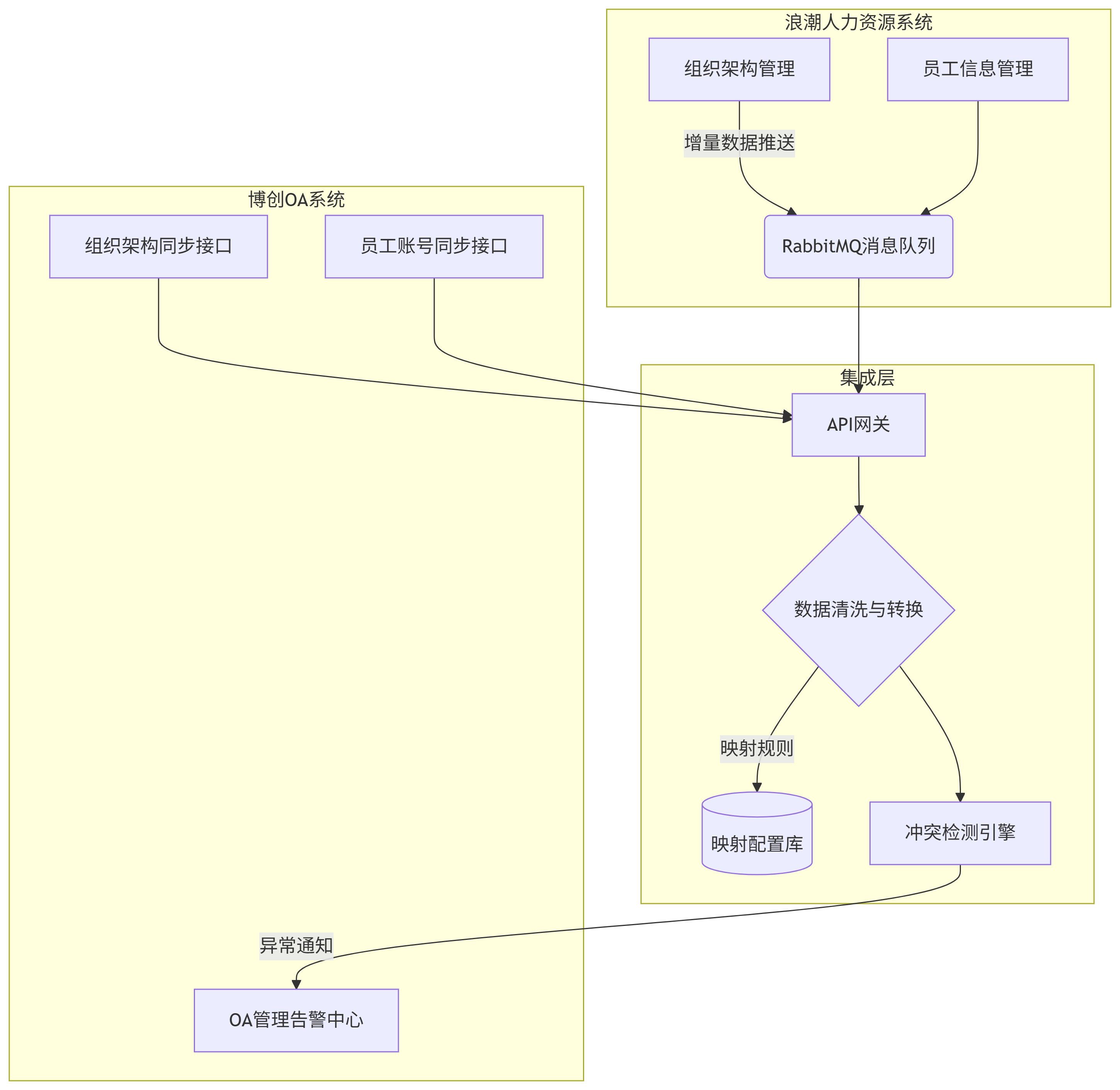 2025-08-07 博创软件博创软件OA与浪潮人力资源系统的集成方案介绍,重点实现组织架构、用户、岗位、职位等基础人事数据的实时双向同步,并附技术架构图与同步逻辑说明。